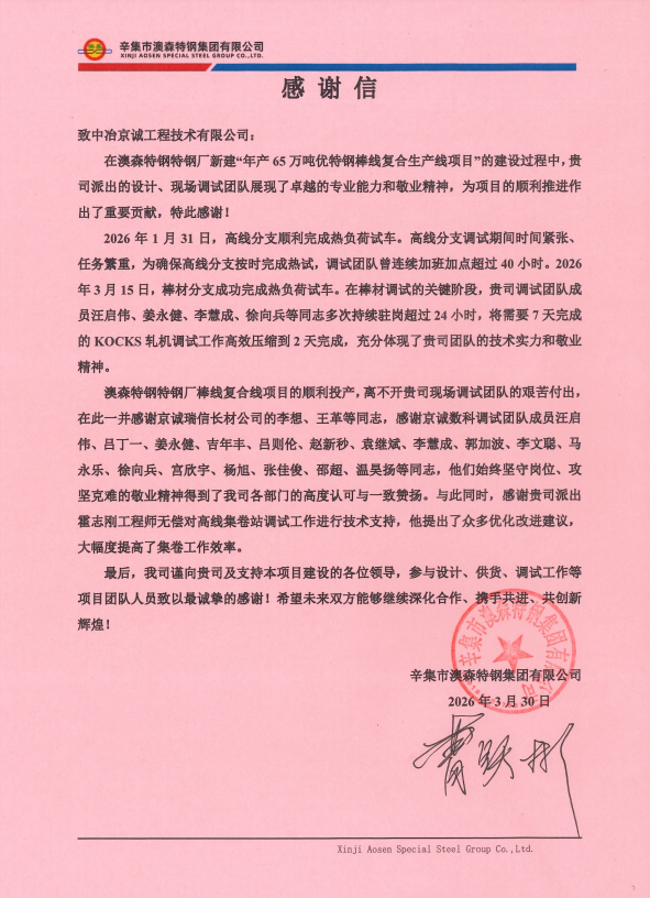 中冶京诚收到辛集市澳森特钢集团有限公司感谢信