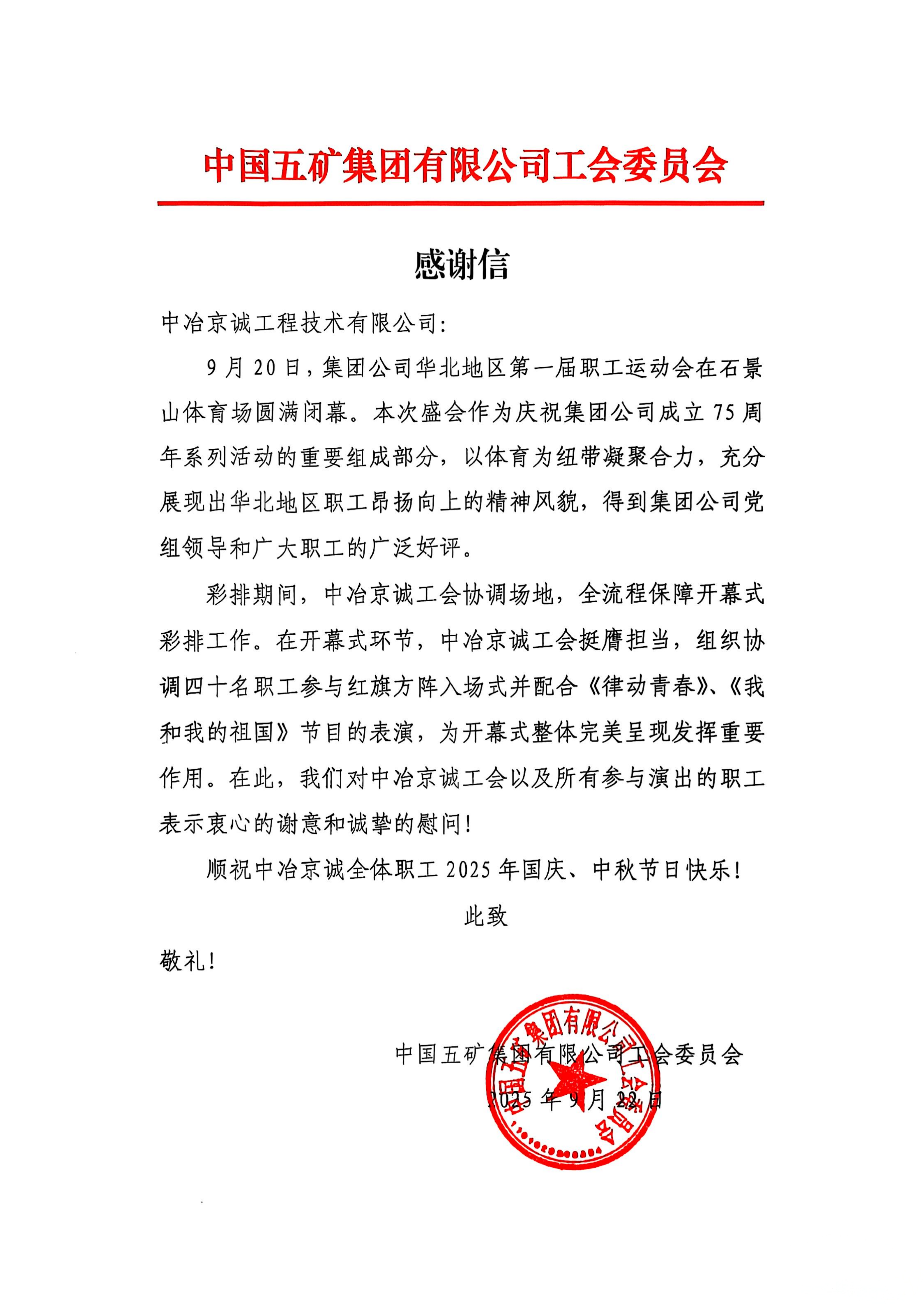 赛后,中冶京诚工会收到集团公司感谢信,对本次运动会中冶京诚工会在协调场地、保障彩排,以及红旗方阵的精彩表现予以赞扬。
