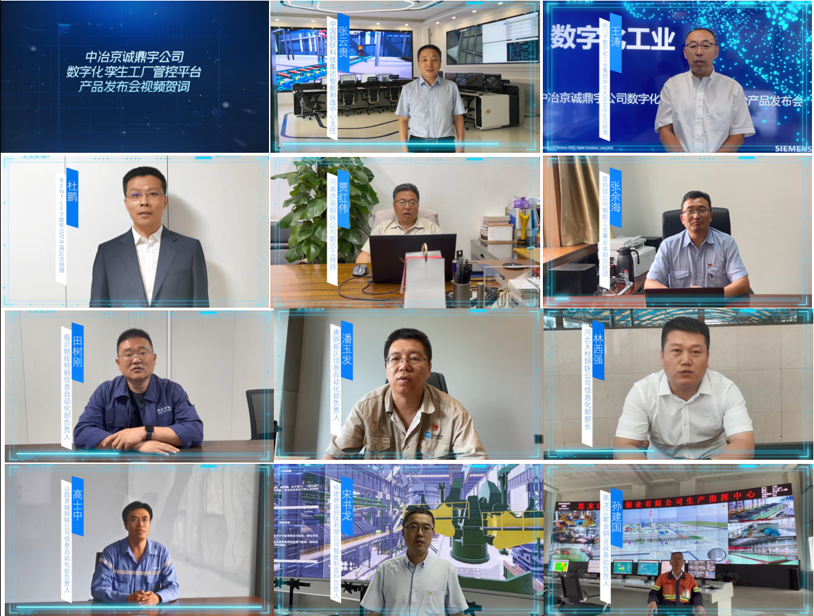 众多行业专家和钢铁企业发来祝贺视频。中国钢研科技集团智能制造中心主任张云贵,西门子数字化工业集团华北大区北京区总经理王涛,BENTLEY软件公司中国区总经理杜鹏,首自信公司智能工业事业本部总经理张余海,河南济源钢铁公司副总工程师贾红伟,河北天柱钢铁公司信息化部部长林西强,山西晋城钢铁公司信息自动化处处长高士中,临沂钢投特钢信息自动化部部长田树刚,福建鼎盛钢铁有限公司智能制造科负责人宋书龙,河钢集团唐钢新区信息化自动化部副部长潘玉发,黑龙江紫金铜业设备处负责人孙建国等领导和专家,纷纷祝贺中冶京诚数字化孪生工厂管控平台正式发布,肯定中冶京诚鼎宇公司在过去的合作中给予的支持和帮助,希望继续精诚合作,共同为钢铁工业数智化转型贡献力量。