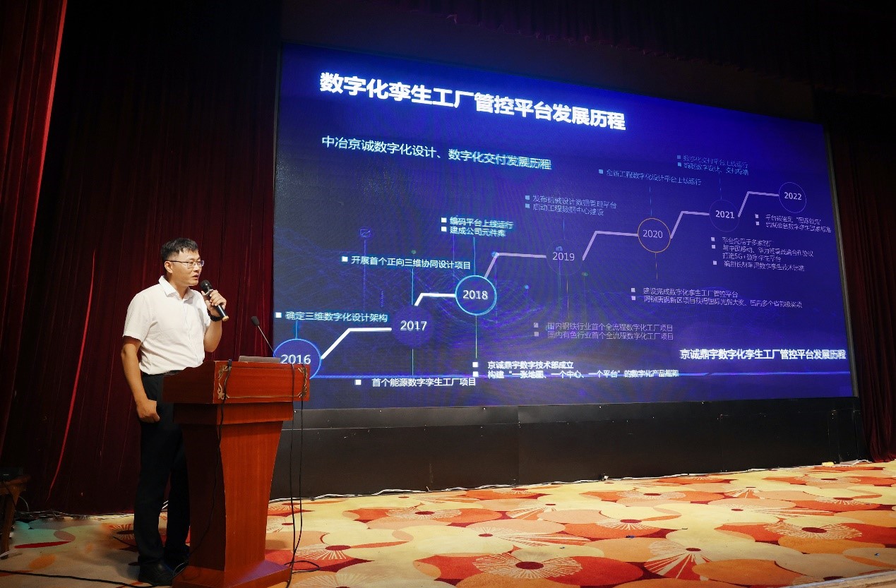 中冶京诚鼎宇公司总经理葛秀欣激动的表示,平台建设取得的成果来之不易。他详细介绍了6年来在中冶京诚数字化建设体系框架下,数字化设计交付和数字孪生工厂两条主线的发展历程,从确立“一张地图、一个中心、一个平台”的产品架构,到签订钢铁、有色行业国内首个数字孪生工厂项目合同,从数字化孪生工厂管控平台建设完成,到被鉴定为“国际领先”、获得奖项殊荣,最终成功发布,过程艰辛,但成果丰硕。