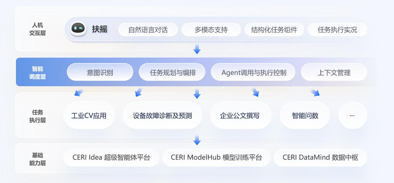 AI产品“扶摇”。该产品以AI为内核,深度重构业务流程与人机协作范式,精准破解企业智能化转型痛点难题,赋能智能制造、智慧城市、企业治理等领域,助力打造专属智能模型与应用生态。该产品构建统一AI中台,夯实人工智能技术架构基础,充实企业数字底座能力,长效支撑未来数字化技术体系的一体化、规范化与安全稳定发展;提供算力资源管理能力,实现对异构算力的统一调度与高效利用;提供数据集纳管能力,支持多模态数据的统一管理、清洗与标注,保障数据质量;完善模型全生命周期管理能力,提供丰富的预训练模型库和主流深度学习框架支持,支撑模型的按需微调与定制化开发;同时提供AI应用开发能力,提供易用、好用的开发工具链,赋能企业快速构建和部署AI应用,支持自主二次开发与场景创新,全面推动AI技术的规模化落地与持续演进,为人工智能垂类大模型及智能体的定制化开发与规模化应用提供全流程支撑。