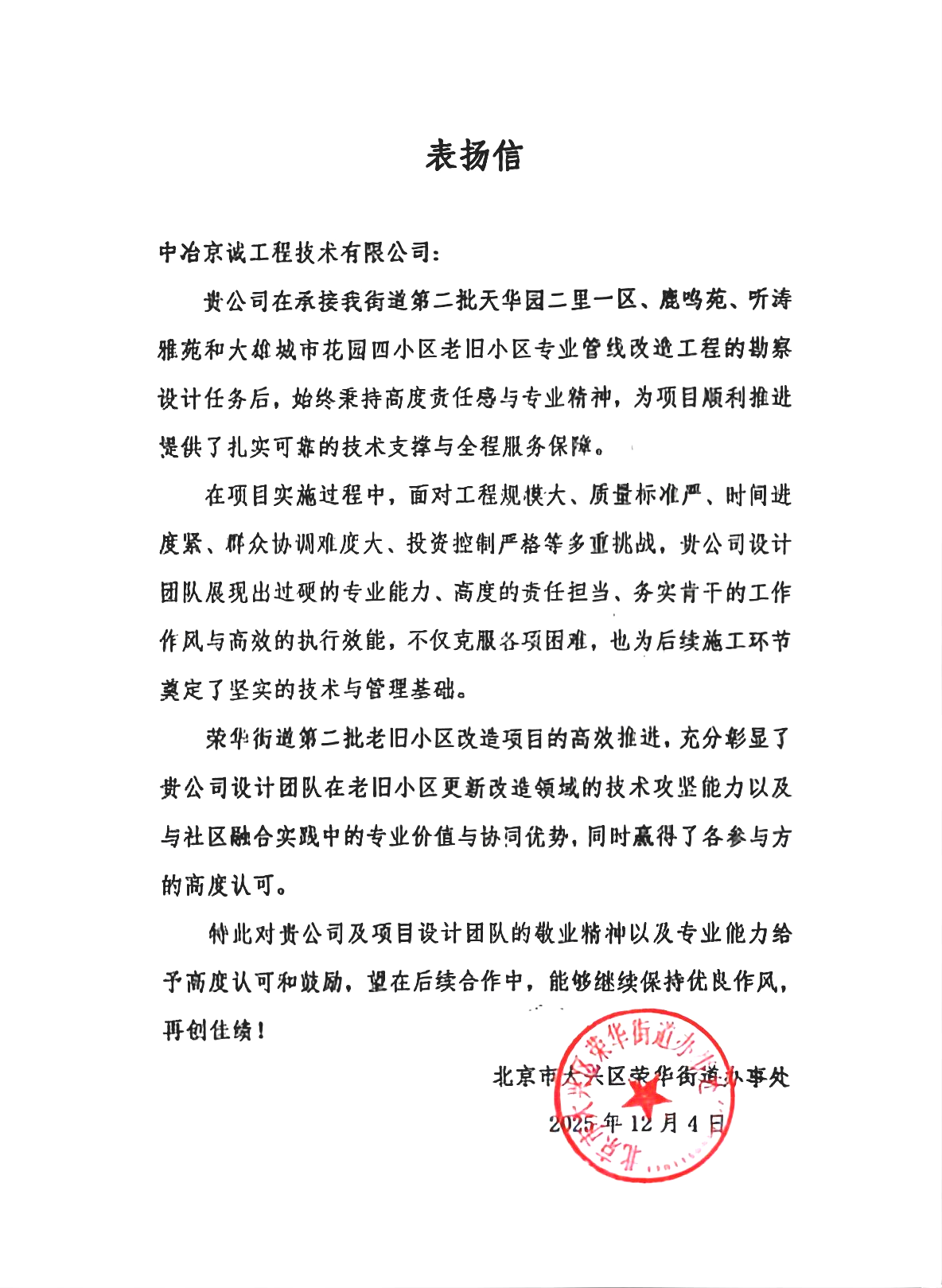 近日,中冶京诚收到北京市大兴区荣华街道办事处发来的表扬信,信中对公司在荣华街道城市更新工作中承担的四个老旧小区改造工程勘察设计服务给予了高度肯定。