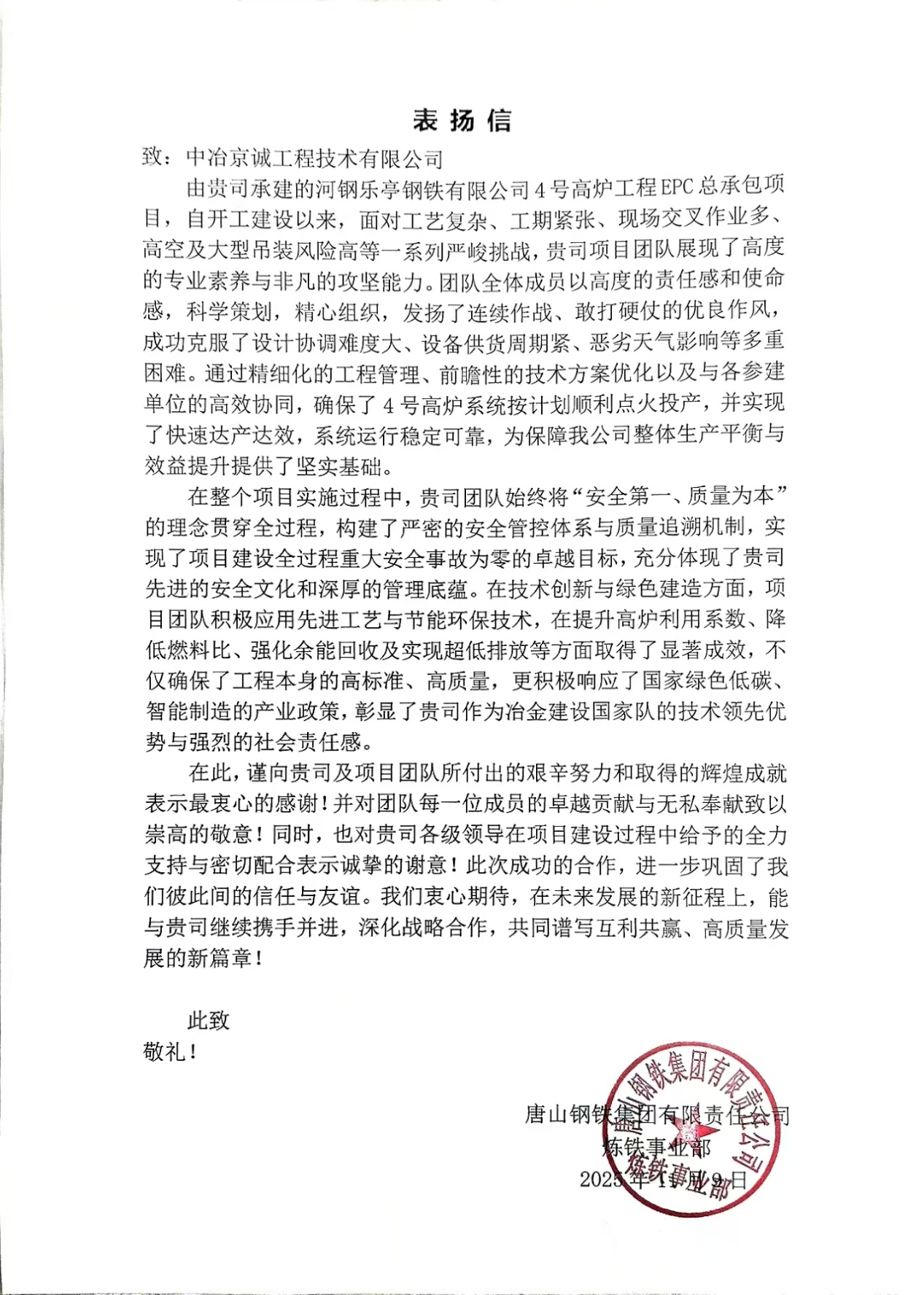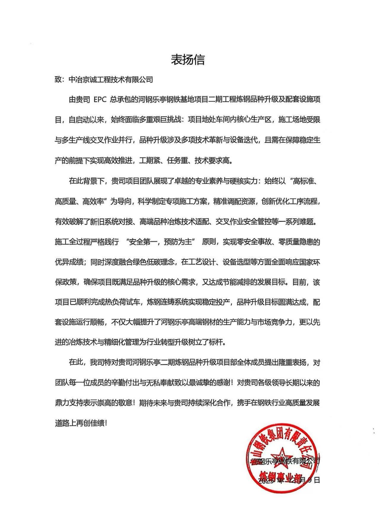 近日,中冶京诚收到河钢乐亭钢铁有限公司发来的表扬信,对公司EPC总承包的高炉和炼钢连铸项目管理团队的专业素养与攻坚能力给予高度认可。