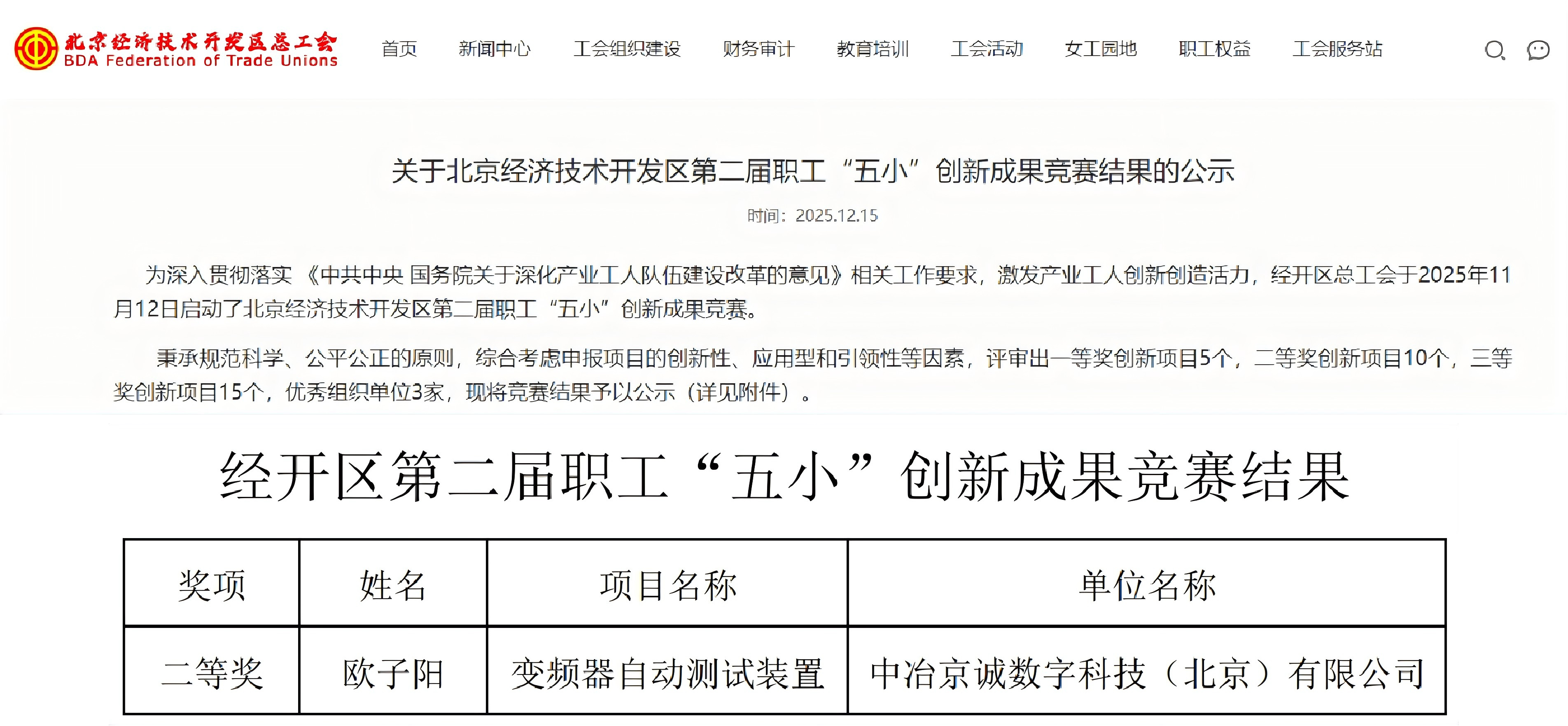 近日,由北京市经开区总工会主办的第二届职工“五小”创新成果竞赛评选结果正式揭晓。中冶京诚数科公司凭借在工业数字化领域的突出创新实力,从142支参赛队伍中脱颖而出,成功斩获二等奖。