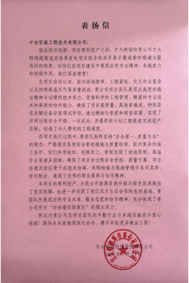 1月13日,中冶京诚收到方大特钢科技股份有限公司发来的表扬信,对中冶京诚总承包的超高温亚临界发电项目团队给予高度评价。