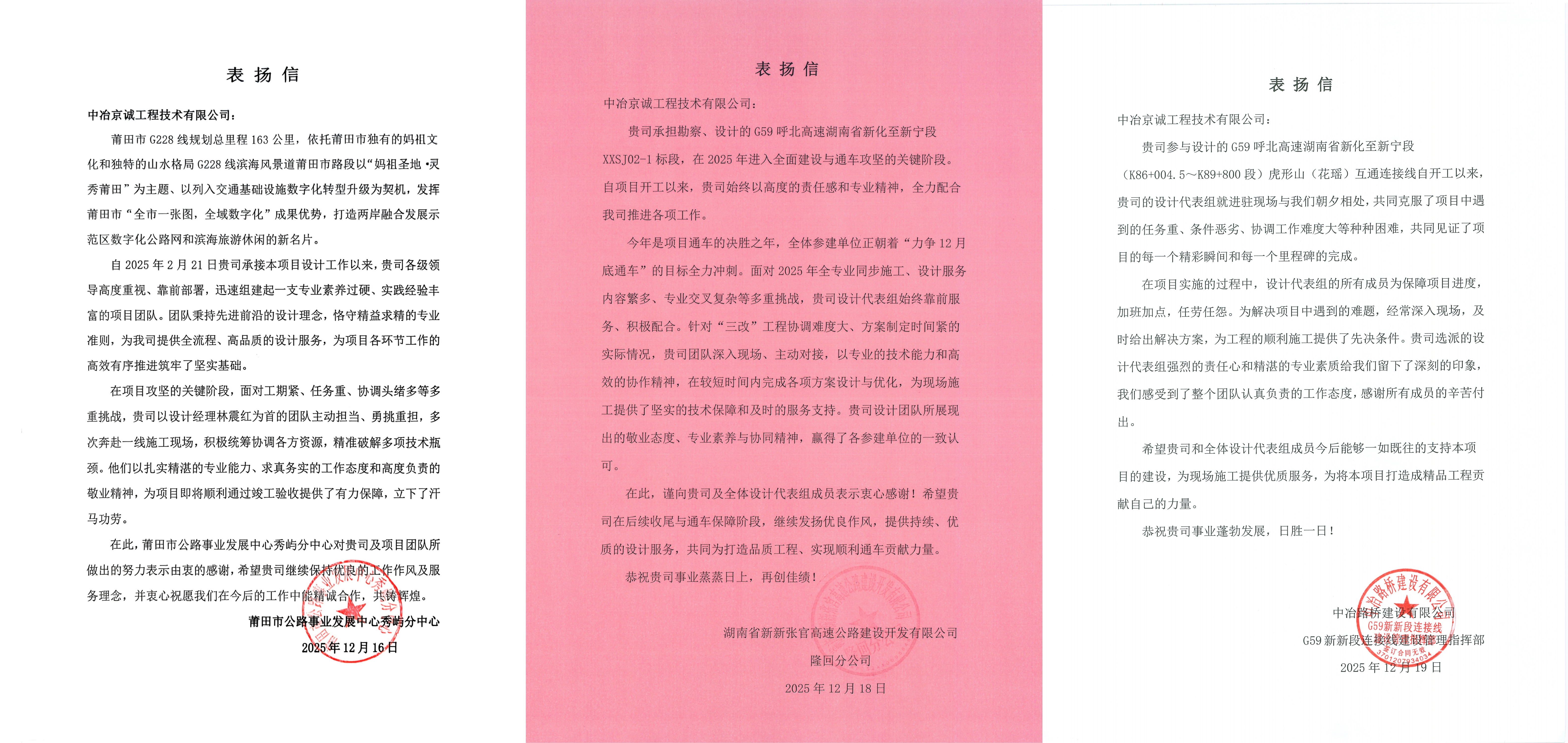 近日,中冶京诚接连收到G59呼北高速公路项目、福建莆田国道G228北岸段路面改造工程项目发来的表扬信,对中冶京诚在项目合作期间展现出的专业能力、敬业精神和责任担当给予了高度评价。
