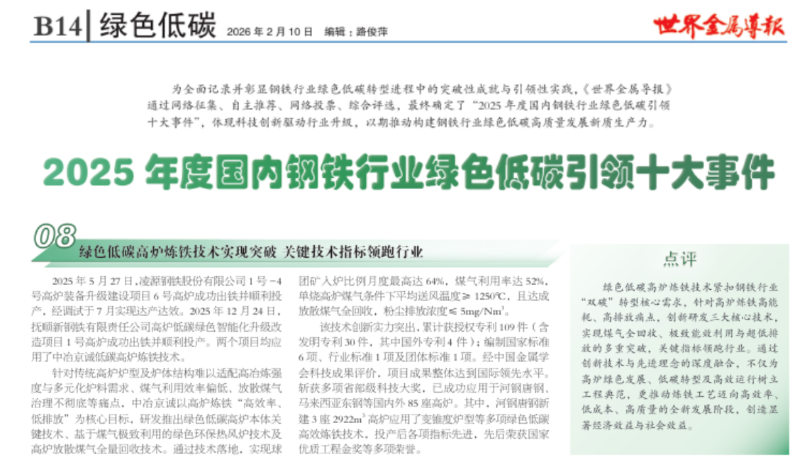 近日,《世界金属导报》发布了“2025年度国内钢铁行业绿色低碳引领十大事件”,中冶京诚绿色低碳高炉炼铁技术成功入选。这标志着行业对公司在炼铁领域绿色化、低碳化创新实践的权威认可。