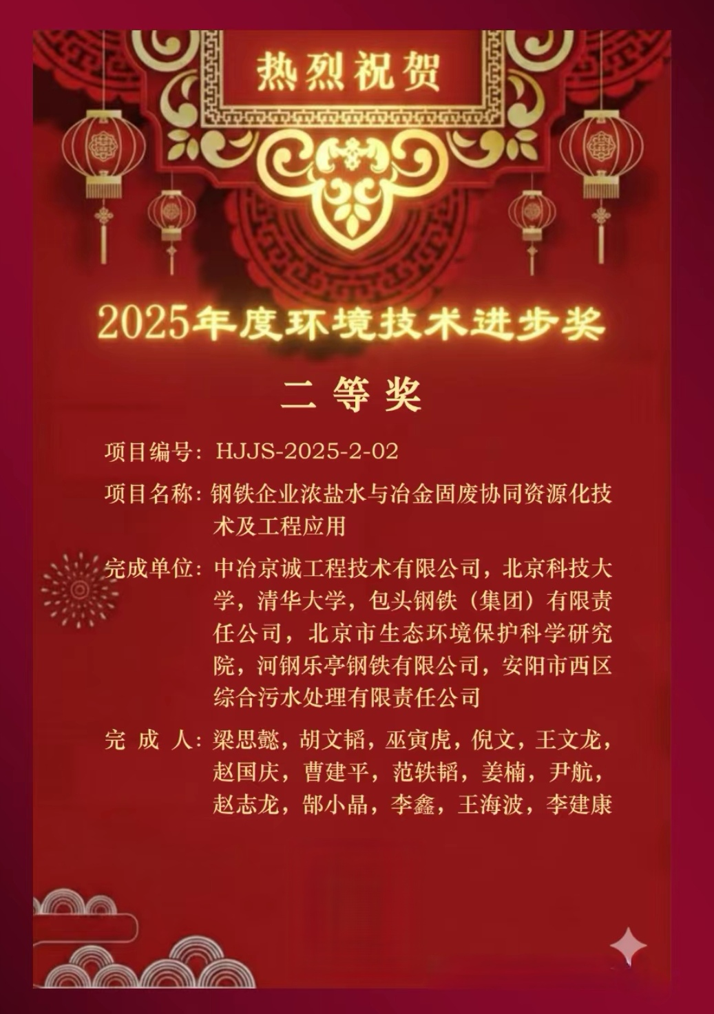2月11日,2025年度环境技术进步奖获奖名单正式揭晓。由中冶京诚牵头,联合北京科技大学、清华大学、包头钢铁(集团)有限公司、北京市生态环境保护科学研究院、河钢乐亭钢铁有限公司、安阳市西区综合污水处理有限责任公司共同完成的“钢铁企业浓盐水与冶金固废协同资源化技术及工程应用”项目荣获二等奖。这是中冶京诚在该权威奖项上首次实现零的突破,标志着行业对中冶京诚在生态环保、绿色低碳领域科技创新实力与工程转化能力的高度认可。