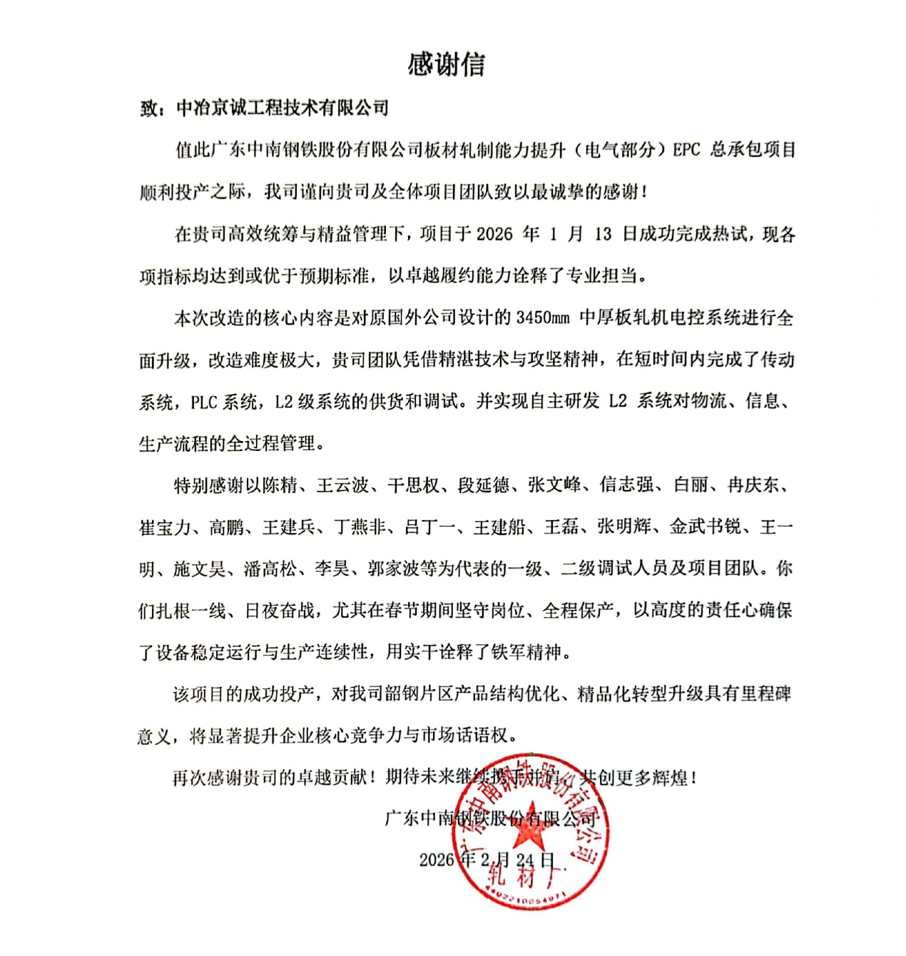 2月24日,中冶京诚收到广东中南钢铁股份有限公司轧材厂发来的感谢信,对公司在广东中南钢铁股份有限公司板材轧制能力提升(电气部分)EPC总承包中的卓越贡献、系统集成能力及项目团队的攻坚精神给予充分肯定。