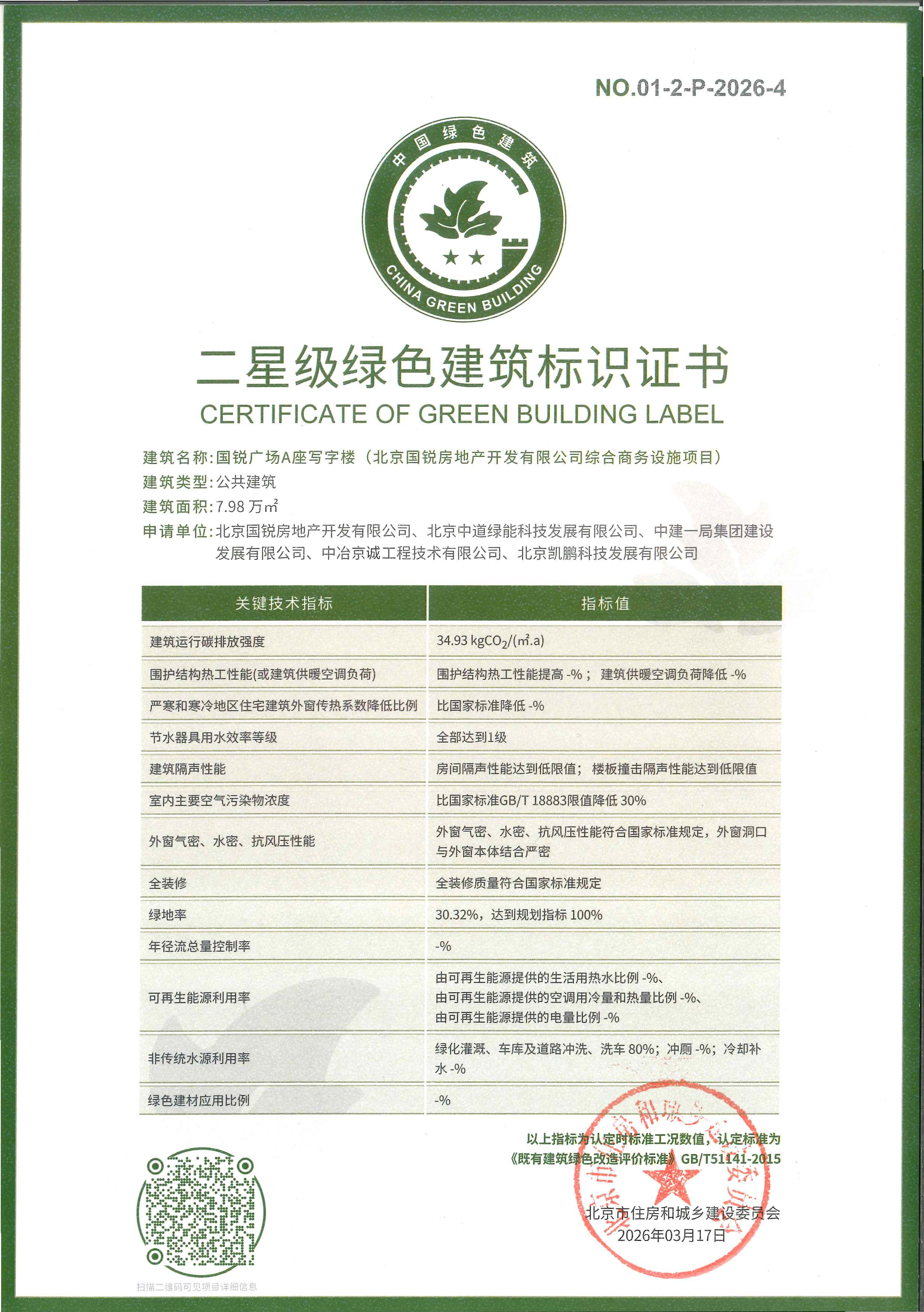 近日,中冶京诚牵头设计的北京亦庄国锐广场A座写字楼,成功获得国家绿色建筑二星级运行标识。该项目此前已取得国际LEED金级认证,目前拥有国际与国内两项绿色建筑权威认证,这标志着该商务地标的品牌价值得到进一步提升,也为公司在绿色建筑领域的持续发展奠定了坚实基础。