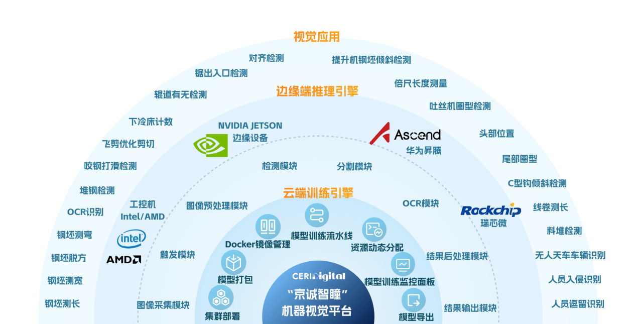 在此背景下,中冶京诚数字科技(北京)有限公司(以下简称“中冶京诚数科公司”)依托多年在工业现场的深度实践与技术沉淀,历经多个典型应用场景的迭代优化,成功将实践经验转化为核心技术能力,全新升级推出“京诚智瞳”机器视觉产品。该产品以自主研发AI中台为底座,集AI模型开发、模型训练与边缘AI视觉终端于一体,不仅为企业数字化转型注入强劲动力,更以“AI+视觉”的创新模式,为“十五五”规划中智能制造目标的实现提供了可落地、可复制的解决方案,为构筑工业智能时代的视觉中枢奠定坚实基础。
